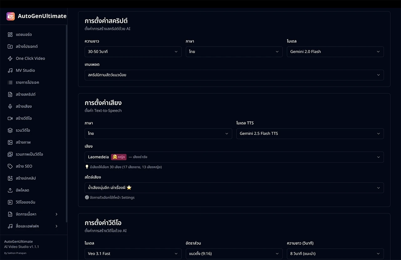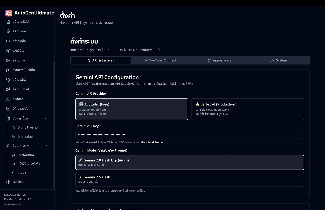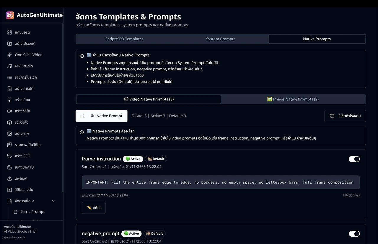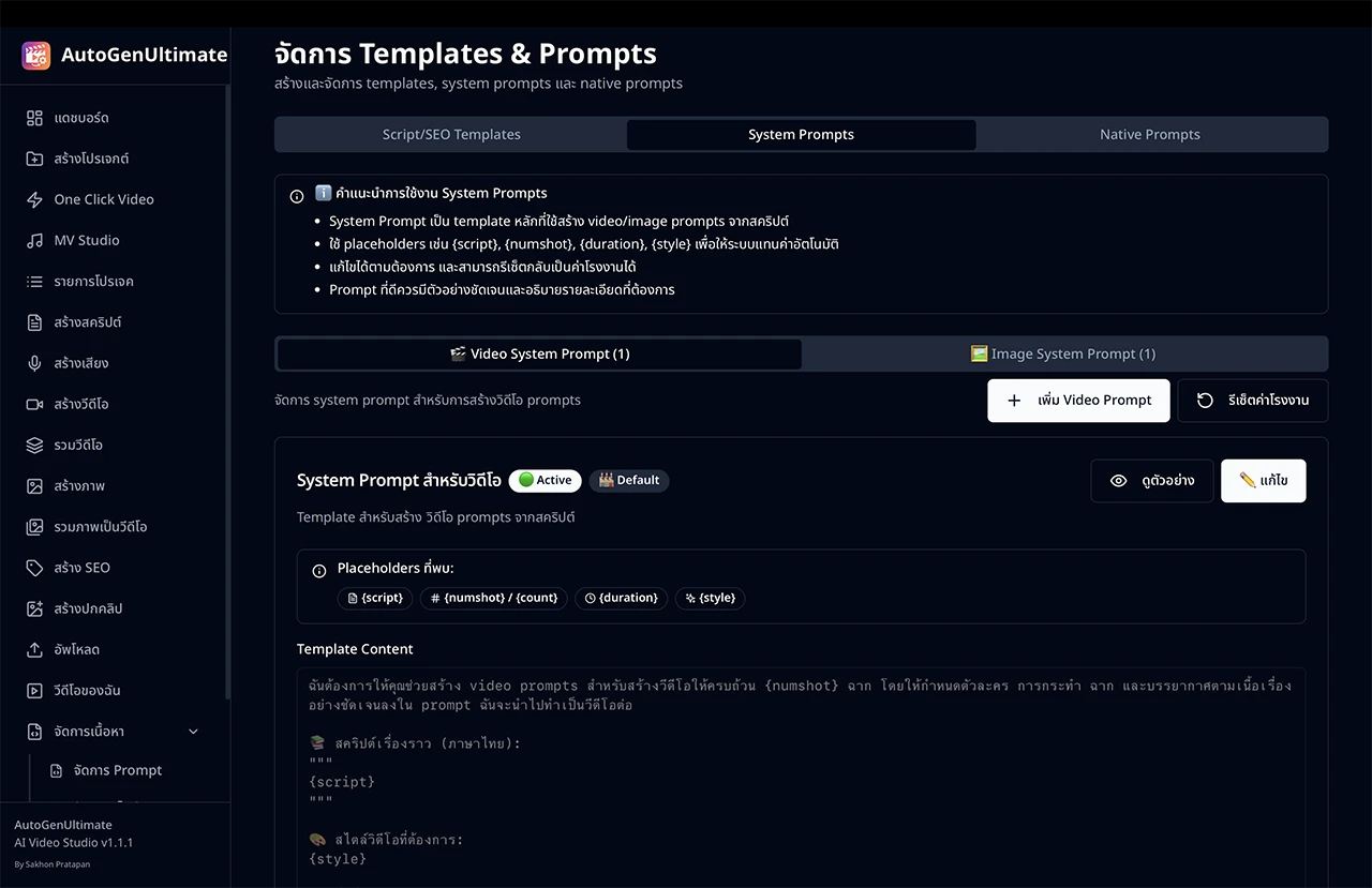 - แก้ไข Prompt Template - ปรับแต่ง Prompt สำหรับสร้างสคริปต์ วิดีโอ และภาพได้เอง